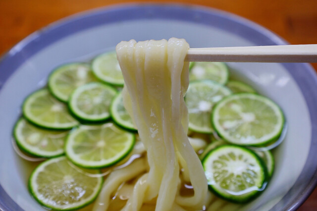 うどん県のお隣徳島県産の薄くスライスされた酢橘がひやひやうどんの上に沢山載せられていて