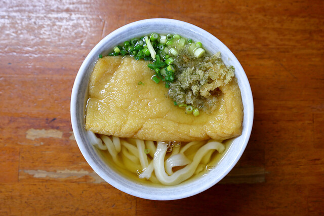いい大豆を使ってるキツネ揚げをぬるいうどんにのせて