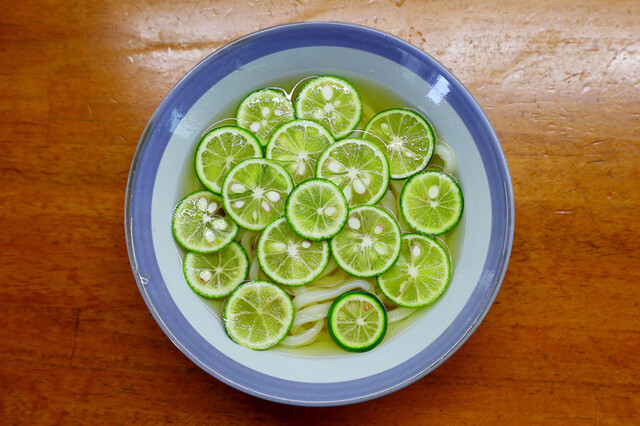 うどん県のお隣徳島県産の薄くスライスされた沢山の酢橘が