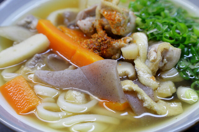 大根や人参、牛蒡などの根菜類や椎茸、油揚げ、コンニャク、白天、国産若鶏モモ肉など具沢山。