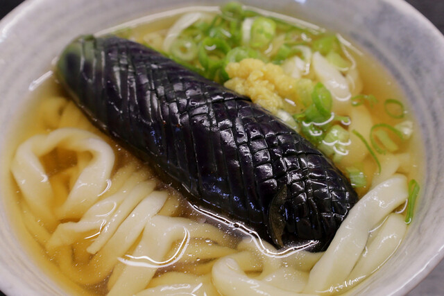 冷たいかけうどんの上に、茄子の揚げびたしがのっています。
