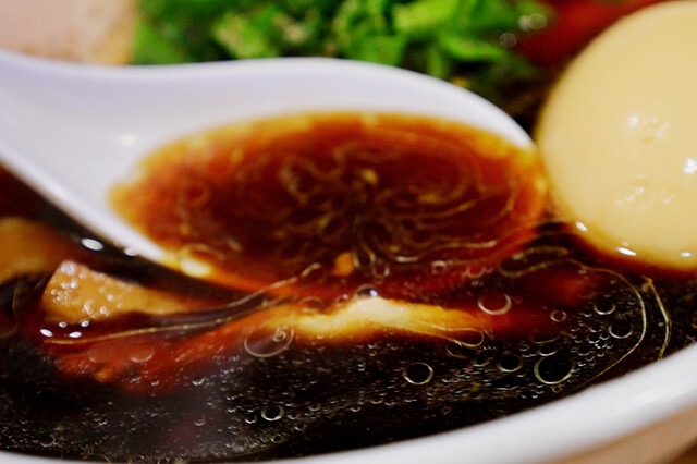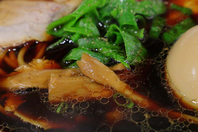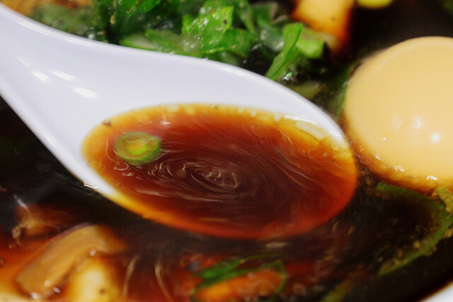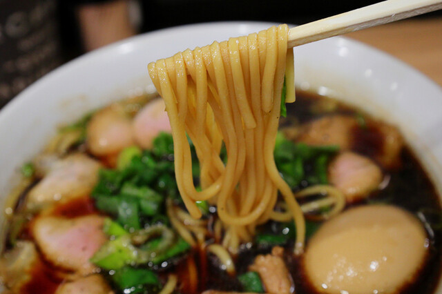 高井田風と言うだけあってガツンと濃口醤油がきいた鶏がらベースの漆黒の清湯スープは