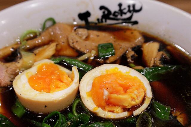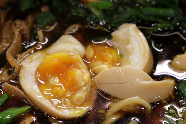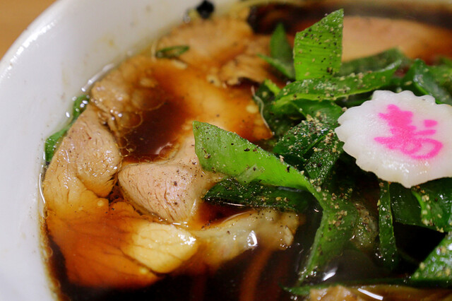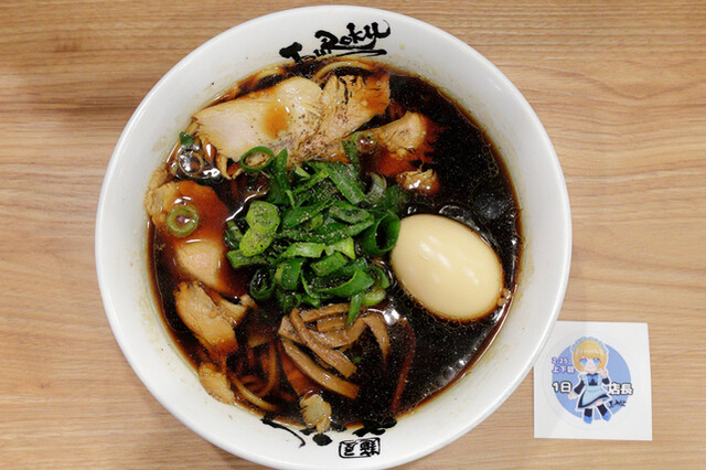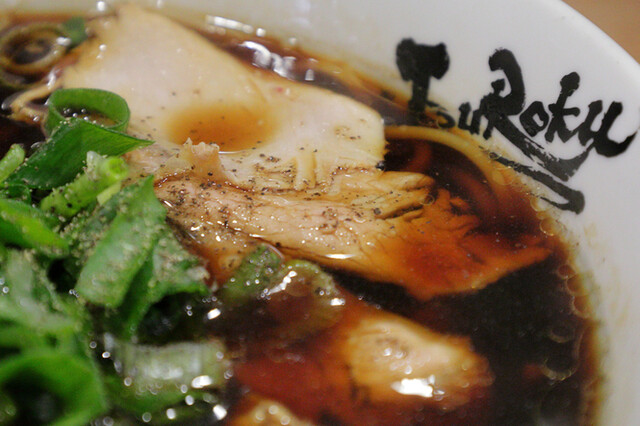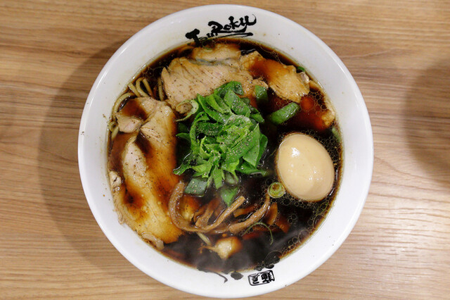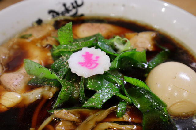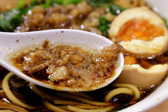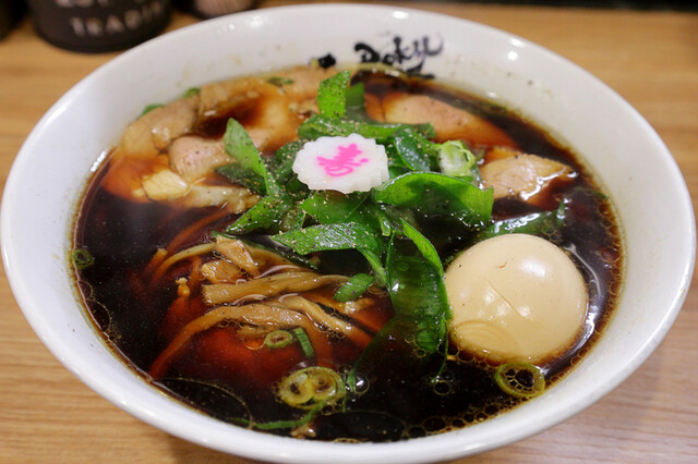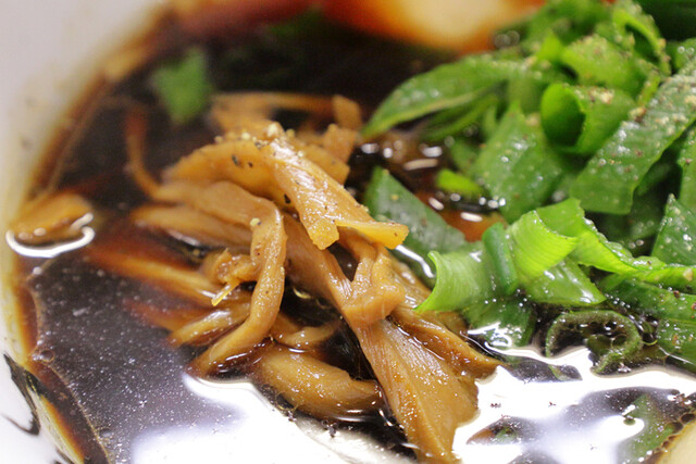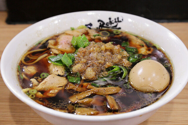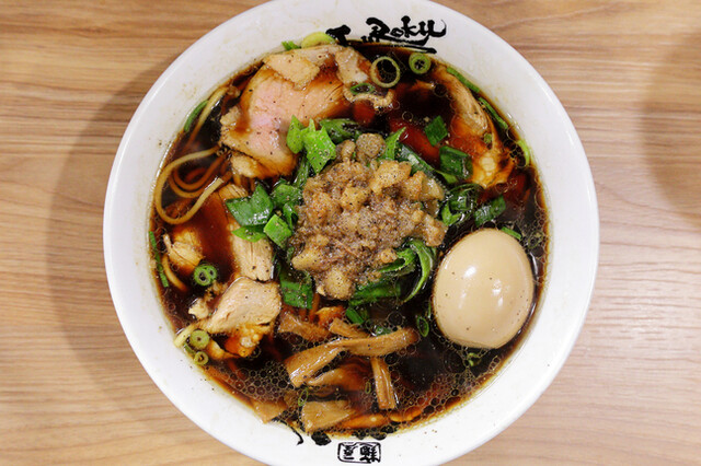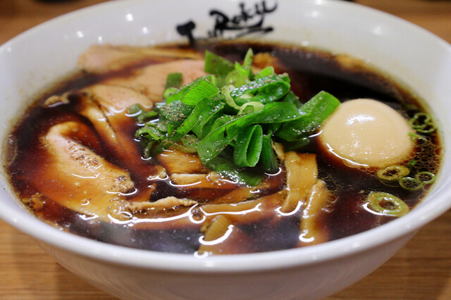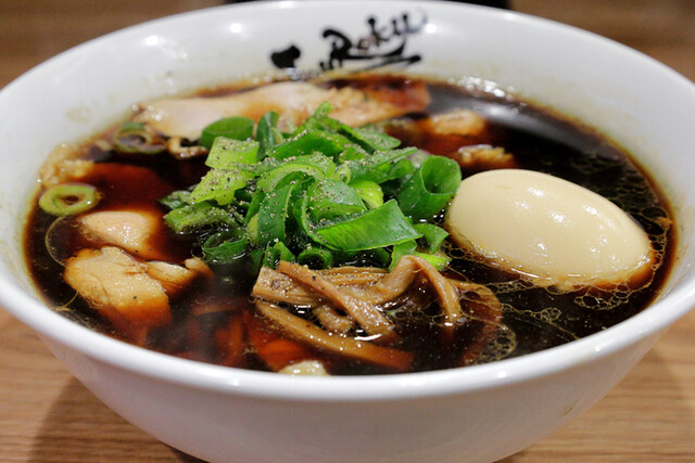 ガツンと濃口醤油がきいた鶏がらベースの漆黒の清湯スープは