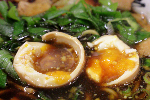 熱々のつけ汁には、牡蠣、九条ネギ、メンマ、味付半熟煮玉子
