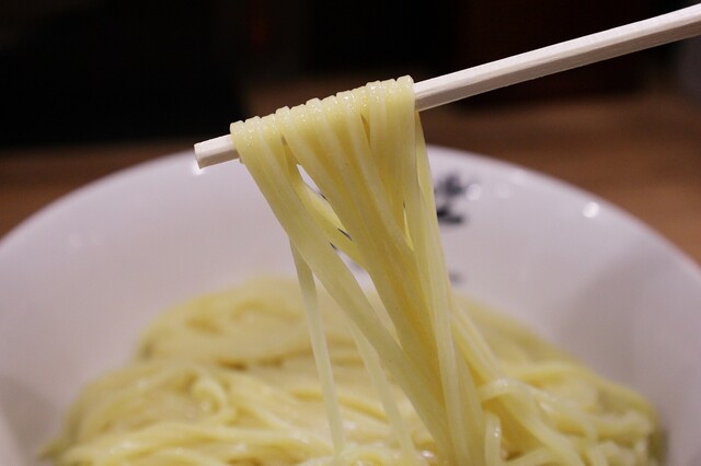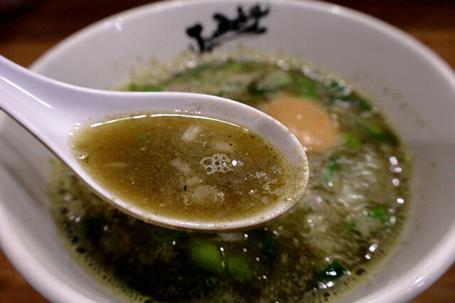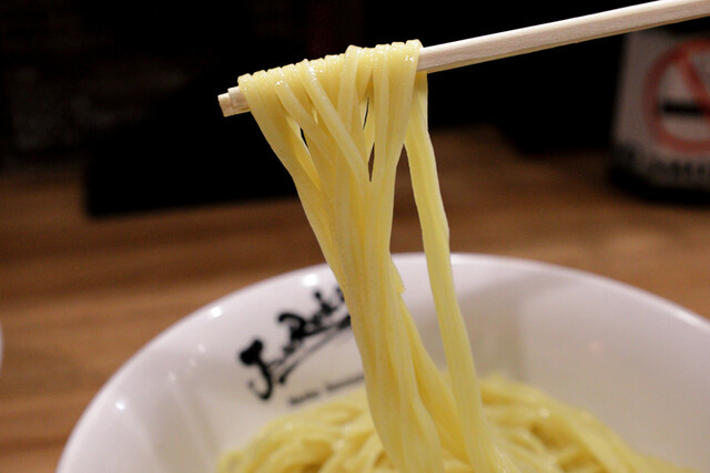 ガッツリ煮干しの濃厚スープに、大量の背脂が加わることでマイルドな味わいに変化。