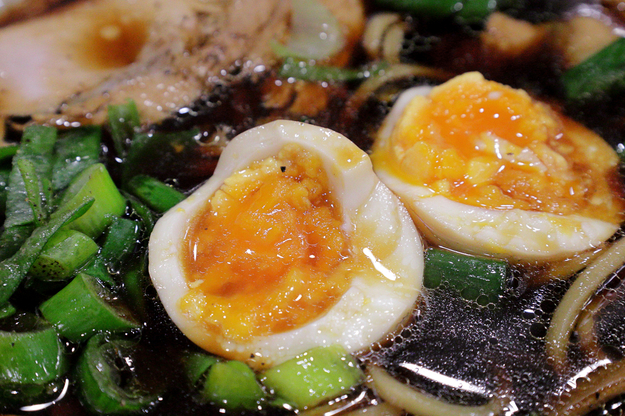 ご飯の上に海苔とネギをのせ、煮玉子や残しておいたメンマや牡蠣九条ネギをのせ