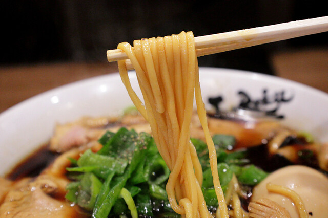 高井田風と言うだけあってガツンと濃口醤油がきいた鶏がらベースの漆黒の清湯スープは