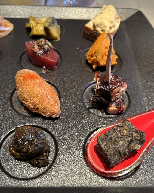 16、フンムスは、中東で食べるお豆を使った料理、焼いた茄子の果肉とスパイス、胡麻と練ったものをカナッペ仕立てにしていました