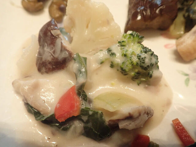 きのことブロッコリーの里芋豆乳クリーム煮はシチューで野菜の歯ごたえのこってるミャ。カリフラワーブロ玉ねぎパプリカほうれんぶなしめじしいたけ。里芋は感じず