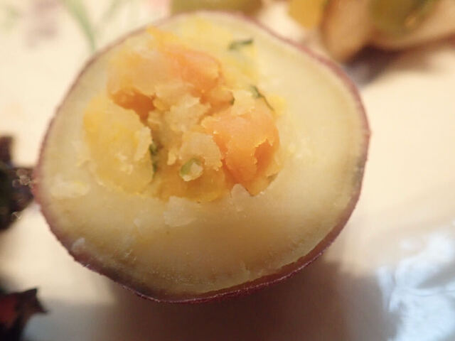 かぼちゃと三つ葉のさつまいもカップ詰めはぽくぽく。自然な甘さ。三つ葉はひかえ目