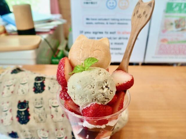 奈良市餅飯殿町。夢CUBEにある【K&M Vegan Kitchen 菜美】さん。にゃらまち猫祭り限定「猫パフェ」古都華いちごに大豆ホイップつぶあん入り和風、ねこさんのもなかつき。2022年6月中旬