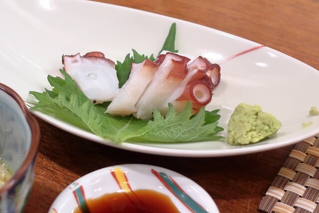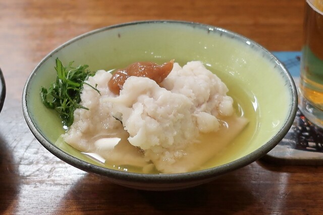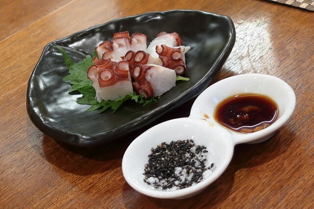 休日の宵の1軒目で1人訪問。たこ祭り開催中!ということで先ずは!と頂いたんは、たこのお刺身を「梅肉だし醤油」と「黒ごまと塩」。店主さんお勧めの「黒ごまと塩」をつけたら黒ごまの風味とシャリっとした塩がとてもええ感じで、ほぼ全て「黒ごまと塩」で頂きましたで!