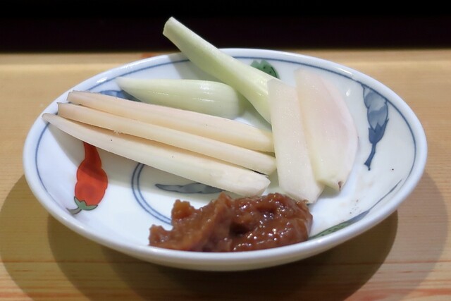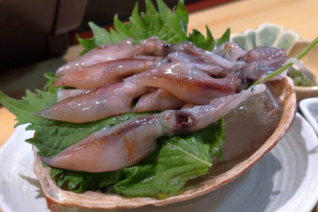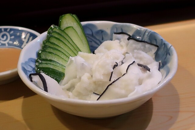 カウンターのネタケースに珍しくウツボがあったんで、どないして頂くか聞いてみたら、造りか天ぷらかとのこと。どっちにしよか思たけど、造りで行けるんもんやったら造りがええな!と造りでお願いしました。ねっとりと歯ごたえがあって美味しい♪♪。でも天ぷらの方が更に美味しいような感じがしましたな(^^;
