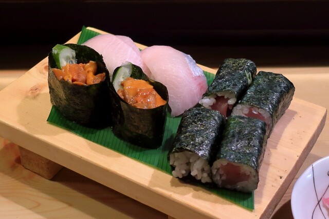 そして何やかんやと話しながら楽しく飲んでたら1時間ちょっと経過して、シャリの用意が出来たとのこと。ほな!ということでお寿司をあれやこれやと、まぐろ、鉄火巻、うに、納豆巻、とろでシメ。気ぃ使こて間に青のりスープを出してくれはりましたわ♪♪