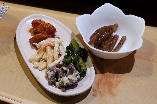 とある宵に1人訪問。そしてどこまで勝たれへんねん!?ていう阪神-広島の試合を観戦しながら頂いたんは、つきだしのアジなます、鶏かわ水菜からアジフライ、アジの骨せんべい、やまぶきの千本炊き、ベビーホタテ酢みそ、新生姜のアテ。