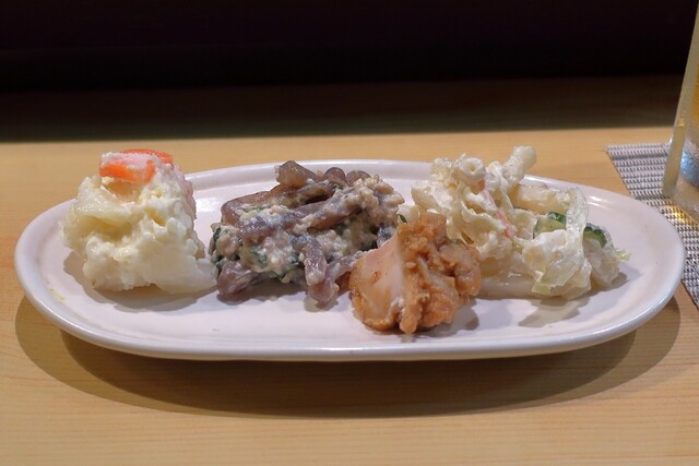 ある日の寄席帰りの2軒目で1人訪問。情けない結末やった今シーズンのあるプロ野球球団の悲しい話をしながら頂いたんは つきだし、〆サバ、銀だらの照り焼き。シメはにぎりで 鯛、はまち。軍艦で生しらす。