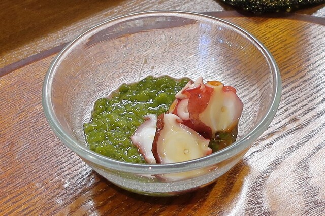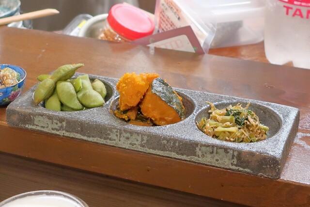とある平日の宵の1軒目で訪問。そして頂いたんは、小芋鶏ミンチくずあんかけ、ポテサラ、きんぴらごぼう、長崎天ぷら、りんごチーズ、つけもの、福岡土産のおすそ分け2品、博多なかなか3種と塩トマト大福。