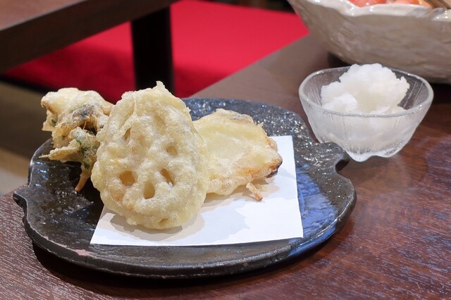 女将さんのお勧め紅生姜の天ぷらはヒロタソースで。京料理の店やのに 大阪っぽい組み合わせやけども、ヒロタソースは上品な感じで行けましたで(^^)