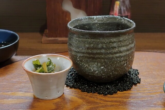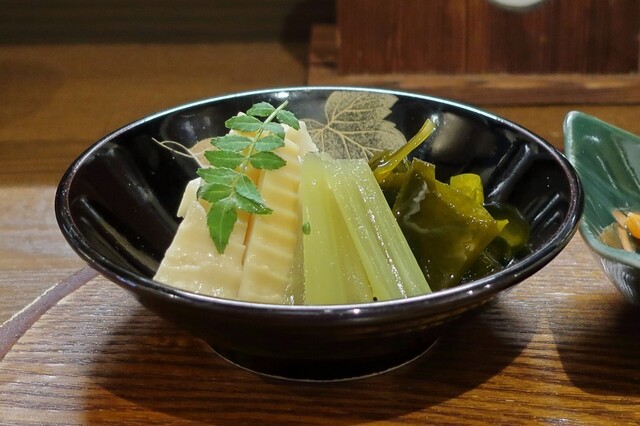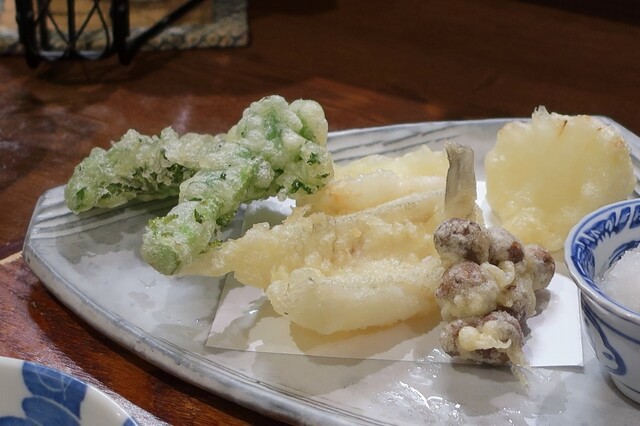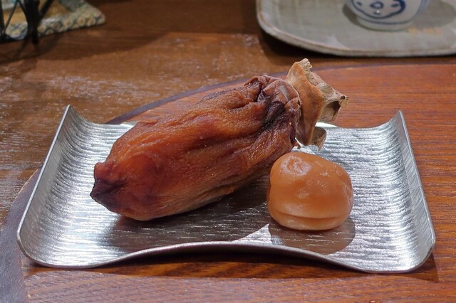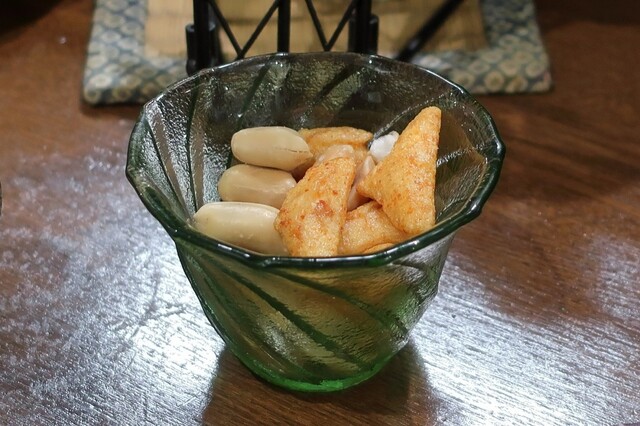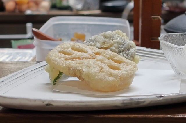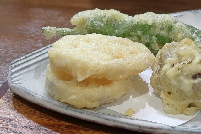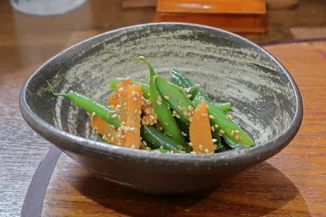 とある宵の1軒目で1人訪問。このちょっと久しぶりの訪問で頂いたんは、きんぴらごぼう、いわしの梅煮、おまかせの天ぷら5品、いぶりがっことKiri、揚げぎんなん。天ぷら5品に季節のマコモダケを入れてくれはりましたで!。シャキシャキと美味しいですな♪♪