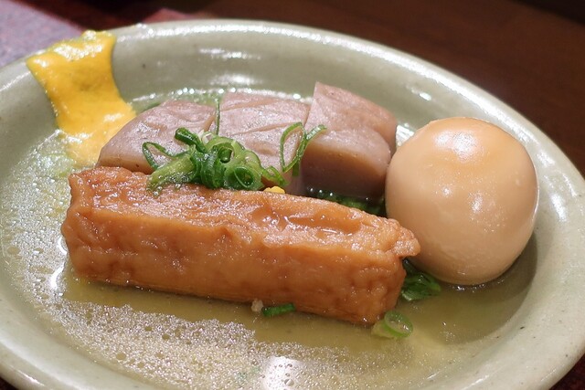 平日の1軒目で1人訪問。そして頂いたんは、おでんの大根、ごぼてん、こんにゃく、牛すじ。焼なす、温ヤッコ、ゆず大根。飲み物は サッポロ黒ラベル生ビール2杯から伊藤園の理想のトマト、芋焼酎 㐂六のお湯割り2杯。
