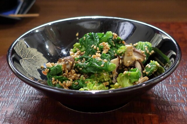 平日の晩酌で1人訪問。そして頂いたんは 香りごぼうとかしわの香味炊き、ほうれん草と厚あげの酢みそ和え、カリフローレ(スティックカリフラワー)ふきみそ・マヨネーズ、かき旨煮。