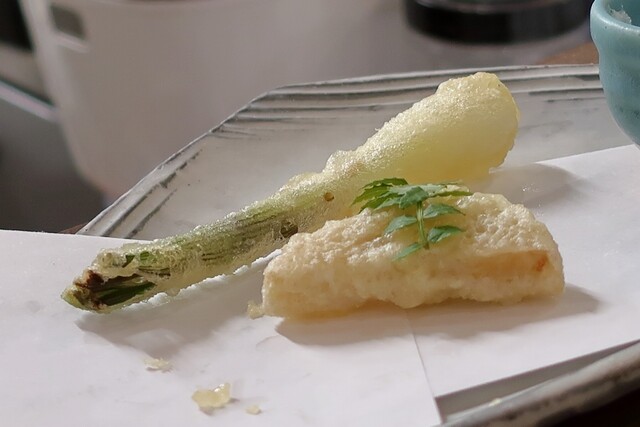 とある宵の2軒目で1人訪問。そして京都五山送り火のYouTube中継を観ながら頂いたんは、南紀勝浦まぐろ料理 竹原さんのラッキョ、肉じゃが。天ぷらは新レンコン、しいたけ、茗荷、バターナッツ南瓜。