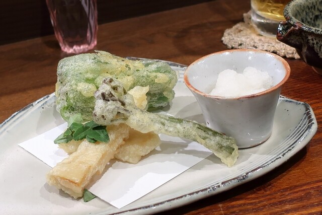 平日の夜に1人訪問。そして頂いたんは 高知に帰らはった常連さんの畑で採れた高知とれとれピーマン、おでん3種類、キングサーモンの塩焼き、門真レンコン天ぷら2つ、キスの天ぷら、舞茸の天ぷら。
