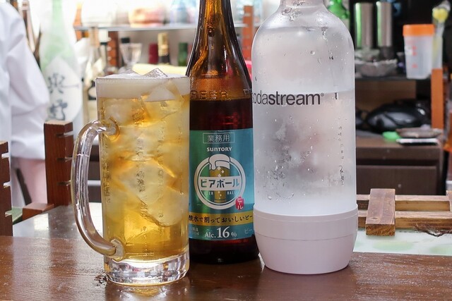 初めて頂いたビアボールは「炭酸で作る自由なビール サントリー謹製ビアボール」てやつで、炭酸割りで飲んだらビールとハイボールの間?て感じ。店舗では10月から発売らしいけども流行るんやろか?。