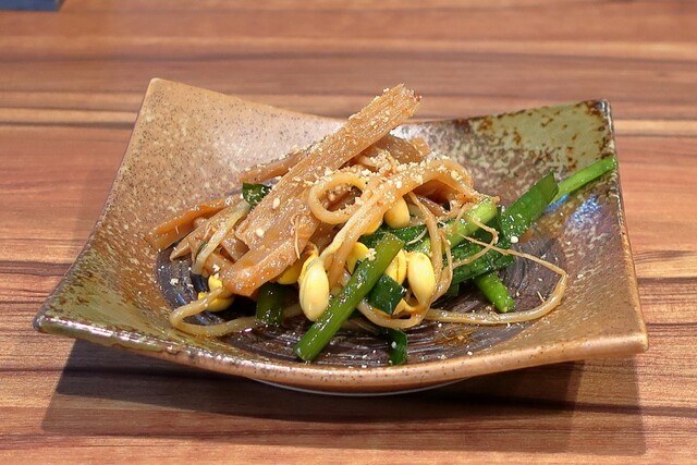 そして、プレミアムモルツ生ビール4杯と共に頂いたんは、新しいメニューの2品、ザーサイと白ねぎ和え、ピリ辛☆鶏マヨ。
