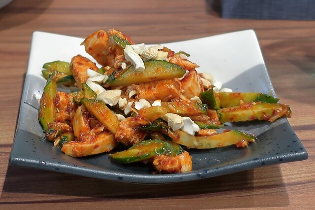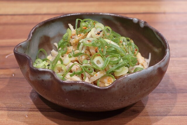 この日に頂いたんは、山芋キムチ418円、旨鶏シウマイ(4個)418円、にらシウマイ(4個)495円、蒸し枝豆308円。開店直後から満席!、持ち帰りの注文も殺到してたんで、早よ出してくれる山芋キムチに生ビールからスタートしましたで(^^;