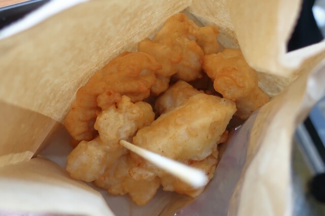 そして頂いたんは鶏唐揚げ(200g)400円とメガレモンサワー319円(ハロウィンのキャンペーンで半額)1杯、カールスバーグ瓶500円2本。唐揚げの他には旨鶏シウマイも店先で売ってはりましたで。