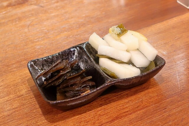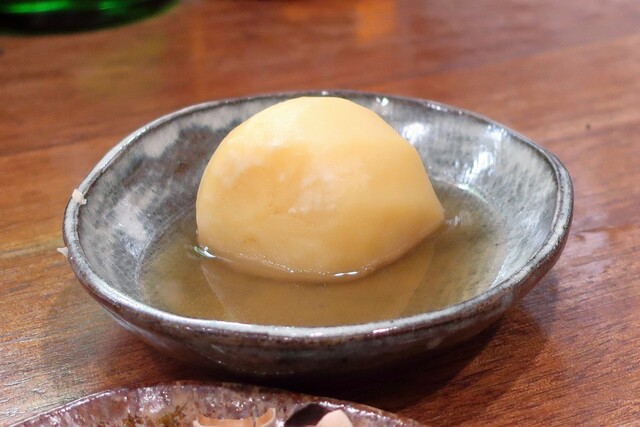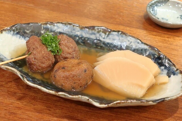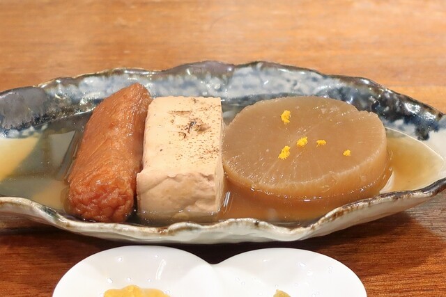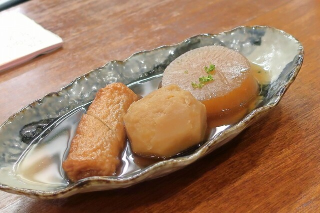 とある週末の3軒目で1人訪問。 そして楽しく頂いた関東煮は ちくわ、大根、じゃがいも、ねぎま小鉢。ぎんなん、うに(特価)!