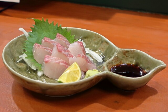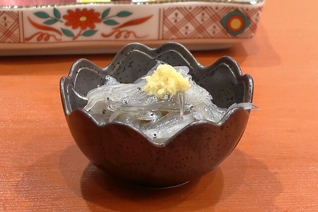 そして頂いたんは、つきだし、兵庫淡路のコショウ鯛焼霜、活磯つぶ貝、おまかせのアテ少々、日生の生カキポン酢。コショウ鯛の焼霜、皮の辺りの旨みに香ばしさ、最高でしたで♪♪