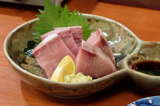 そして楽しく頂いたんは、北海道 天然ブリ造り1000円と つきだしの生しらすポン酢。移転後もええお造り用意してくれてましたで♪♪