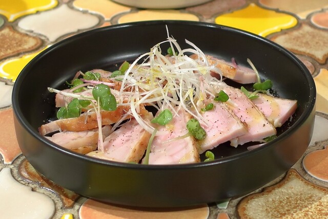 休日の3軒目で3人シメ訪問。そして3人で頂いたんは、期間限定 旬のおすすめメニューから 鶏生ハムと桃(^^)