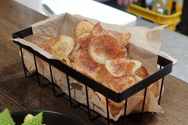 注文を聞いてからジャガイモをスライスして作り始めてくれはるポテチ。ええ揚げ具合でサクッと美味しかったです。ポテチにバジルソースも行けますで(^^)