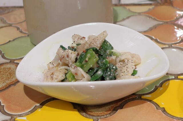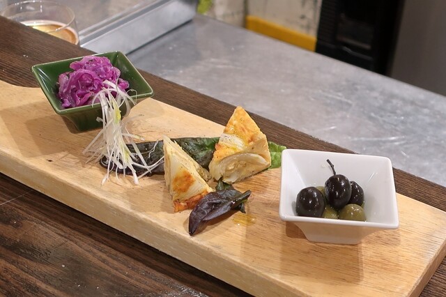 ラム焼肉の後やったんで、前菜3種盛りはちょっと軽めのんで!とお願いしたら「つぼみ菜とはっさくマリネ、蒸し鶏きざみわさび、キーマカレーフリッタータ」の3種にしてくれましたで。爽やかに美味しかったです(^^)
