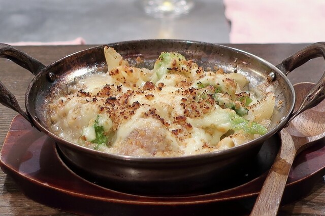 とある寒い寒い宵の2軒目で1人訪問。そして頂いたんは、前菜3種盛りの鶏皮とわけぎの洋風ぬたあえ、根菜カポナータ、春キャベツとはっさくのマリネから ロマネスコと鶏のほくほくにんにくマカロニグラタン。