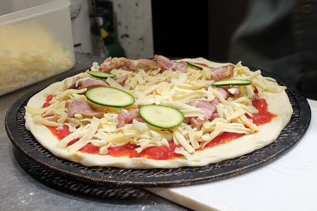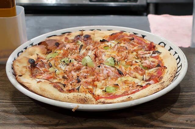 前菜5種盛りは、新玉ねぎとむらさきキャベツの発酵マリネ、スモークチキン、ポテサラ肝アンチョビ、蒸し鶏葱ソース、キーマカレーのフリッタータの5種。お腹が減ってたんで おまかせのピザの重いのを!と お願いしたらフンギのピザをアレンジして出してくれましたで。フンギとキーマカレーやったかな?