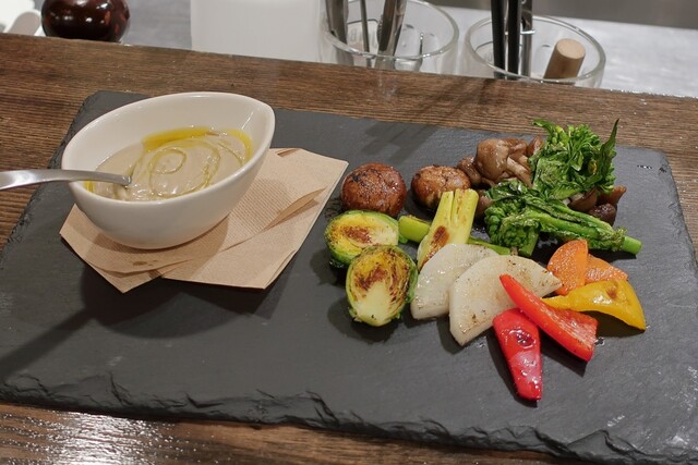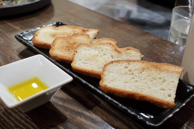 そして頂いたんは、かぶらのナッツとハーブバターのほくほくオーブン焼き。カキとキノコ、野菜色々のアヒージョ。バケットが品切れやったので自家製フォカッチャのカリカリ気味に焼いたやつ。