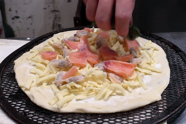 そして頂いたんはピザのフンギ。気まぐれきのこ、チーズ、クリームのピザですわ。この夜の気まぐれきのこはシメジでしたで。このピザも美味しゅうございましたで(^з^)-☆