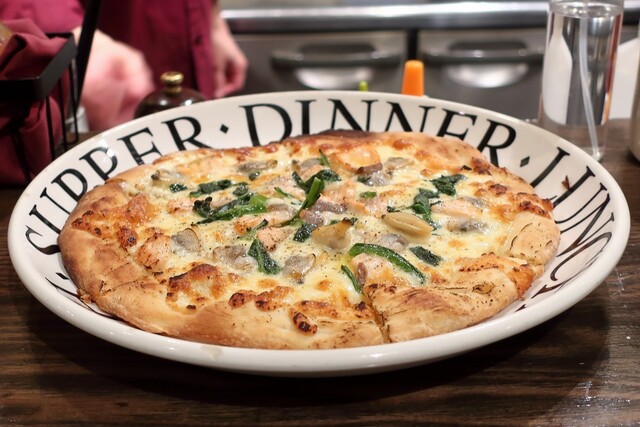 シメは鮭とあさりのピザ。旨みと塩加減、香ばしさが最高ですがな。これは名作ちゃいますか(^з^)-☆。飲み物は熟撰生ビール3杯とハイボール1杯で。