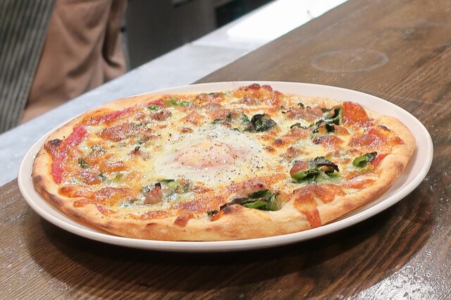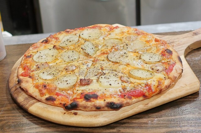 そして熟撰生ビール2杯と共に頂いたんは、自家製生地のピザメニューからのパターテ。自家製鶏ベーコンとジャガイモのトマトベースピザですわ。鶏ベーコン、ジャガイモ、トマトの甘みに旨み、生地の香ばしさがええ感じのピザでした♪♪