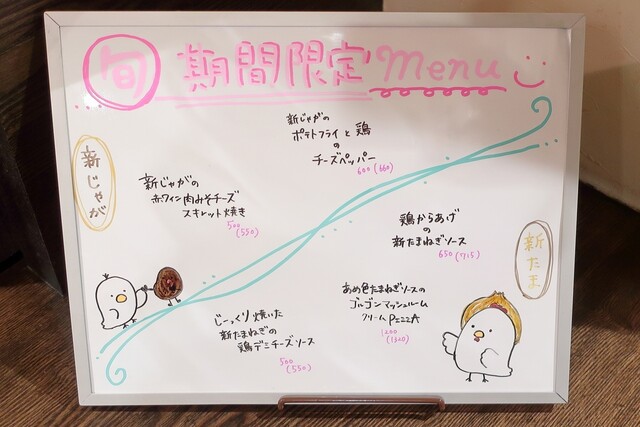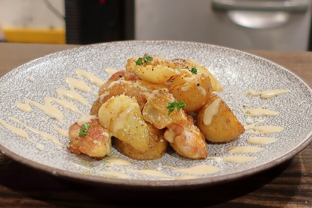 そして先ずは1人で、途中から参加の飲み友さんと2人で頂いたんは、旬 期間限定メニューから、とろっと新たまと鶏のさつま揚げ、新じゃがの赤ワイン肉みそチーズ スキレット焼き、新じゃがのポテトフライと鶏のチーズペッパー、キッシュ、鶏からあげの新たまねぎソース。