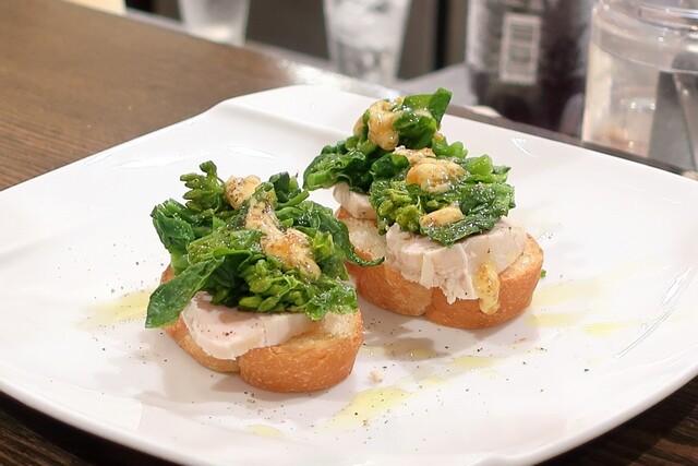休日、八重桜の花見散歩スタートからの3軒目で1人訪問。そして熟撰生ビールたっぷりと共に頂いたんは 旬の期間限定の菜の花メニューから 鶏ハムとキンカンソースの冷製ブルスケッタ。しらすのゼッポリーニ。