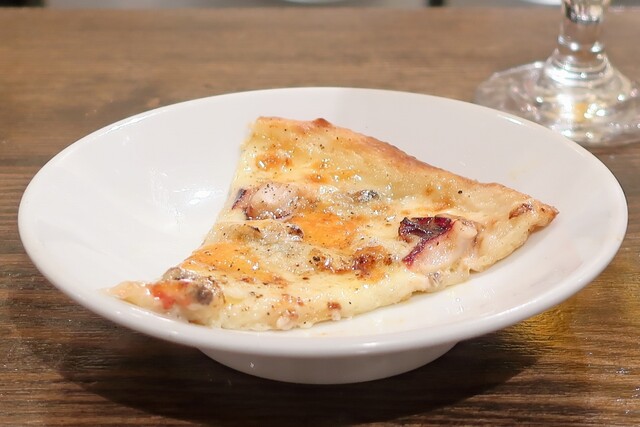 そして熟撰生ビール数杯と共に頂いたんは、期間限定ピコメニューから 和歌山県産 布引だいこん 鶏出汁白ワイン煮 チーズパリパリ添えと自家製生地の気まぐれピザ。この夜はずり皮時雨煮と何か?のビザ。甘辛い時雨煮がええ感じのピザでした!