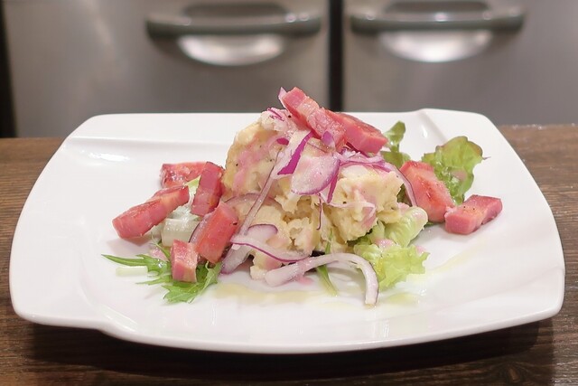 そして たっぷりの熟撰生ビールと共に頂いたんは、期間限定メニューからカプレーゼ サラダ仕立てから、定番の ポテサラ ベーコンのっけ。あとは何故か遠くから来はった常連さんに自家製生地のピザ1/8を2枚頂きました。ご馳走さまでした(^^)
