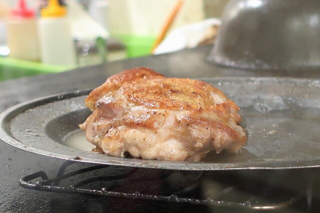とある宵の4軒目で3人シメ訪問。そして珍しく厨房奥のテーブル席で頂いたんは、自家製ピクルス、朝引き地鶏のカルパッチョ、生わかめのゼッポリーニ、エビ 鶏 マッシュルームなどのアヒージョ、バケット、鶏サラミ。