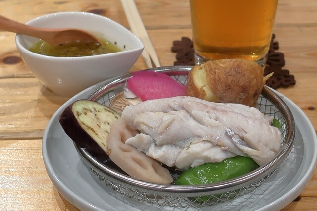 自家製ソーセージのごぼう、シロエビ