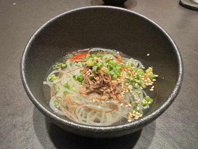 レンゲにのせての提供なので、一口で食べやすい。 チーズの下にレアな肉が刻まれて入ってます。